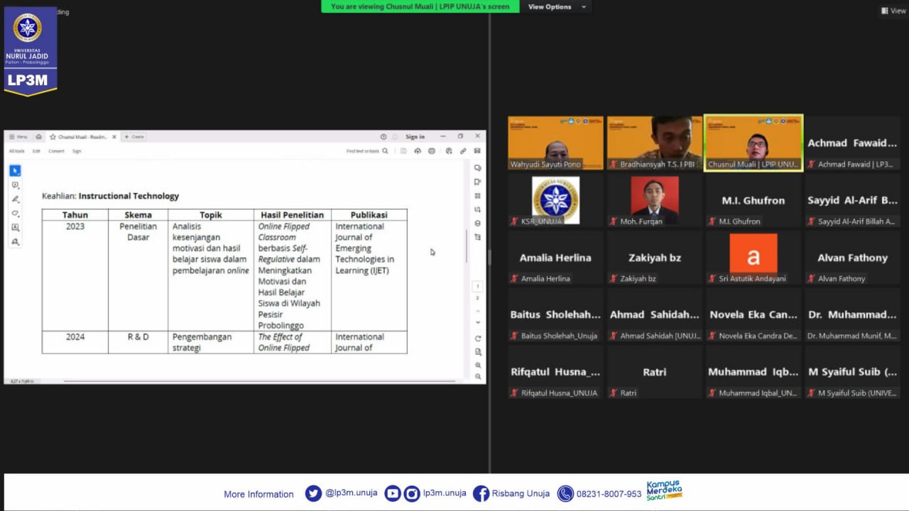 Senin, 14/08/2023, Lembaga Penerbitan, Penelitian, dan Pengabdian kepada Masyarakat (LP3M) UNUJA bekerjasama dengan Lembaga Pengawasan dan Penjaminan Mutu (LPPM) UNUJA menyelenggarakan kegiatan "Penyusunan Roadmap Penelitian dan Manajemen Kepustakaan" dihari kedua ini kegiatan di fokuskan pada teknis penyusunan roadmap penelitian dosen tetap di lingkungan UNUJA. Kegiatan ini dipandu oleh Dr. Achmad Fawaid, M.A. M. A, Kepala LP3M Unuja, dan Prof. Ir. Wahyudi Sayuti Pono, M.WoodSc., Ph.D. dari Universitas Papua sebagai narasumber yang ditunjuk oleh kementrian Pendidikan dan Kebudayaan Republik Indonesia.